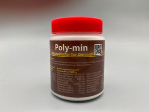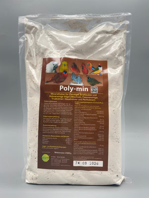 Poly-min ist ein Mineralfutter, das essentielle Mineralien enthält, welche Vögel täglich für ihren Metabolismus benötigen. Es ist besonders reich an fein gemahlenen fossilen Austernschalen, die sich im Vergleich zu gemahlenem Kalkstein langsamer auflösen und so eine kontinuierliche Calciumversorgung gewährleisten. Studien haben bestätigt, dass fossile Austernschalen als langsam lösliche Calciumquelle die Gesundheit, das Wohlbefinden und die Leistungsfähigkeit der Tiere positiv beeinflussen.