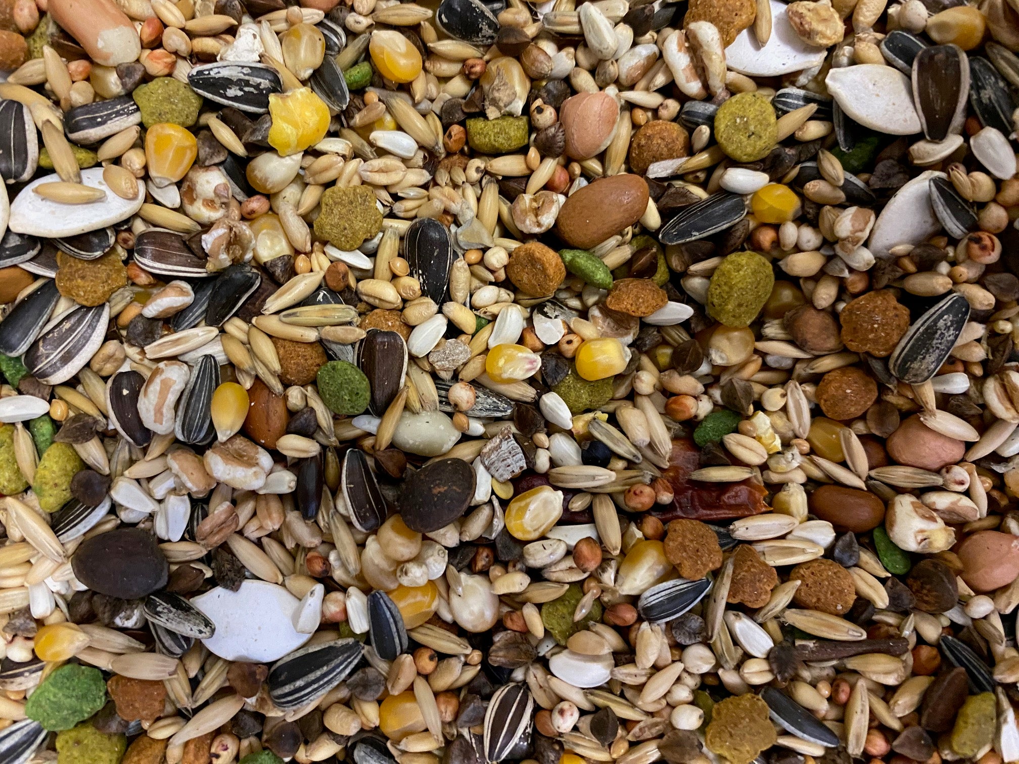 Hafer, Weizen, Buchweizen, Paddy Reis, Mais, Gestreifte Sonnenblumen, Milokorn,Dari, Kanariensaat, Kürbiskerne, Silberhirse, Cardy, Weiße Sonnenblumen, Geschälte Erdnüsse, Zirbelnüsse, Plata Hirse, Puffweizen, Puffmais, Hagebutten, Rote Peperoni, Maxi V.A.M. Körnchen, Austernschalen.